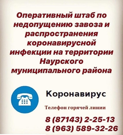 29.03.2020Уважаемые жители Наурского муниципального района!По поручению Главы Чеченской Республики, Героя России Рамзана Ахматовича Кадырова в районе создан оперативный штаб по недопущению завоза и распространения коронавирусной инфекции COVID-2019.По всем возникшим вопросам вы можете обратиться на горячую линию