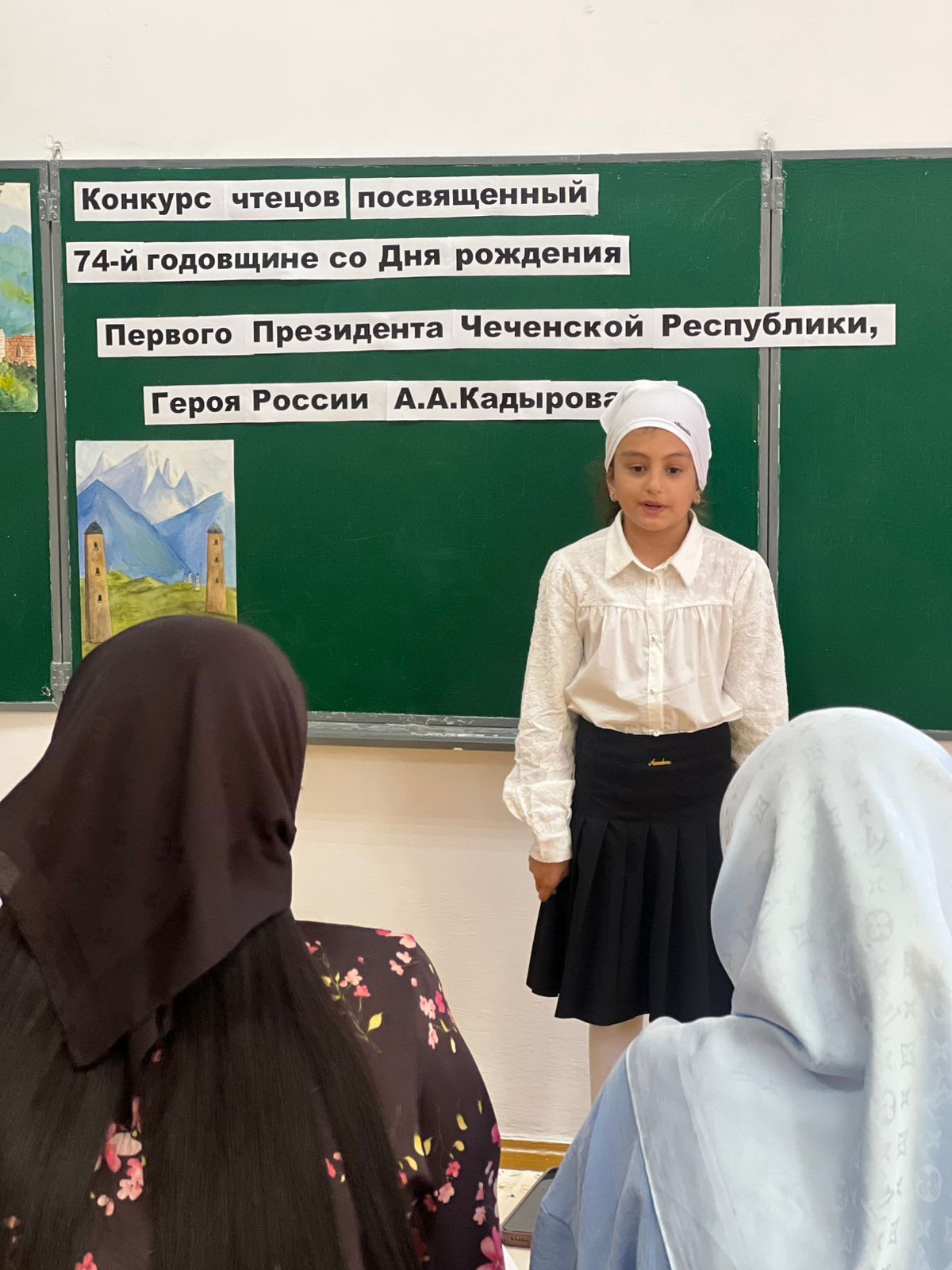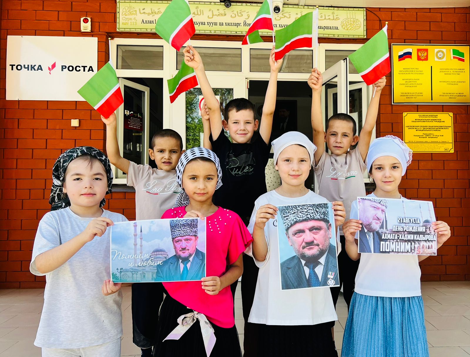 В соответствии с планом мероприятий посвященных 74-й годовщине со Дня рождения Первого Президента Чеченской Республики, Героя России А. А. Кадырова с 18 августа прошли следующие мероприятия: школа оформлена банером, прошёл конкурс чтецов посвящённых А-Х. Кадырову, ребята читали стихи чеченских писателей, все участники награждены грамотами. Прошло торжественное собрание трудового коллектива с имамом села Кусаевым Н. М., который провел беседу о жизни и деятельности А. А. Кадырова, педагог-организатор Акбулатова Л. М. провела акцию с учащимися.
