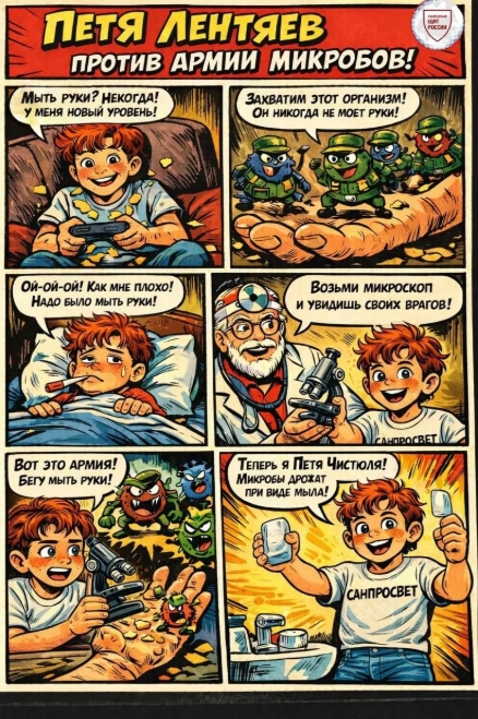 12.03.2026Роспотребнадзор представляет: приключения Пети Лентяева! Уважаемые родители и юные читатели! Представляем первый выпуск новой образовательной серии комиксов «Приключения Пети Лентяева»! В комиксе «Личная гигиена» наш герой Петя вступает в увлекательную борьбу с армией коварных микробов! Вместе с ним юные читатели узнают какие еще секретные приемы помогут победить невидимых врагов. Что ждет читателей в 2026 году? Летом Петя раскроет тайны правильного хранения продуктов и защиты от пищевых отравлений. Осенью ваш интерес захватят приключения Пети в мире прививок и защиты от инфекций. А к зиме Петя становится настоящим экспертом по созданию безопасного дома. Комиксы разработаны специалистами Роспотребнадзора с учетом возрастных особенностей детей и содержат важную информацию о здоровье в увлекательном формате. Скачать первый комикс «Личная гигиена» можно прямо сейчас по [ссылке]! https://downloader.disk.yandex.ru/preview/2b481485089048fb7217ee366e679a4f022ed2c4e742fc7df69a28bd6aa8c301/69b02397/5oqwi_gFIoEYS93WgayaxRYyITZ7iYzmh-3HQIttjR6M_KcSWSjr05_sSOQLYX3hJ6U4Tqxh9owrRptLbB8eJg%3D%3D?uid=0&filename=IMG_6311%20%282%29.jpg&disposition=inline&hash=&limit=0&content_type=image%2Fjpeg&owner_uid=0&tknv=v3&size=2048x2048 Помогите Пете победить микробов и станьте настоящими защитниками здоровья вместе с проектом «Санпросвет» Роспотребнадзора! Справочно. Творческая работа одного из победителей Всероссийского конкурса детских рисунков «Персонаж здорового образа жизни» 2023 года, где был изображен Петя Лентяйкин, вдохновила на создание познавательных и ярких визуальных материалов для проекта «Санпросвет» для детей в 2024 году. Появился герой детского «Санпросвета» Петя Лентяев – веселый школьник, задорный мальчишка, который раньше ленился, но потом понял, что соблюдение простых правил гигиены и здоровый образ жизни помогают быть активным и здоровым, а также хорошо учиться. Петя в доступной и простой форме рассказывает другим детям про важные правила заботы о здоровье