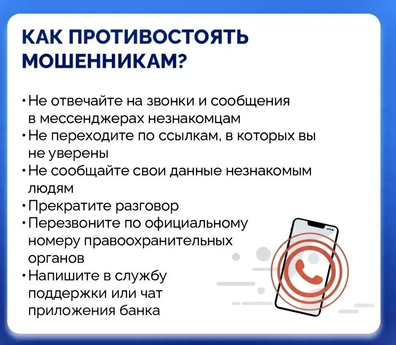 16.04.2026ФСБ России обращает ваше внимание на участившиеся случаи телефонного мошенничества. Злоумышленники звонят детям и взрослым, представляясь сотрудниками правоохранительных органов (ФСБ, МВД, Следственного комитета).Что делают мошенники:— Сообщают, что «ваш родственник попал в беду»— Говорят об «оформлении кредита мошенниками на ваше имя»— Требуют перевести деньги на «безопасный счет»— Просят назвать код из СМС или данные банковской карты— Убеждают никому не рассказывать о разговореВажно знать:- Сотрудники ФСБ и полиции никогда не звонят гражданам с подобными требованиями- Не существует никаких «безопасных счетов»- Коды из СМС, пароли и данные карт нельзя сообщать никому